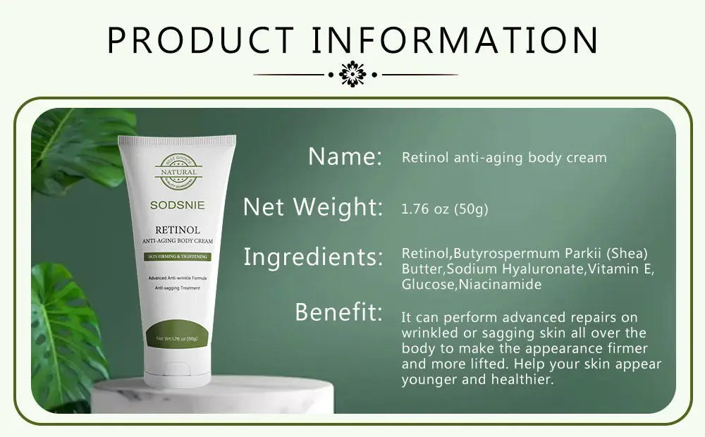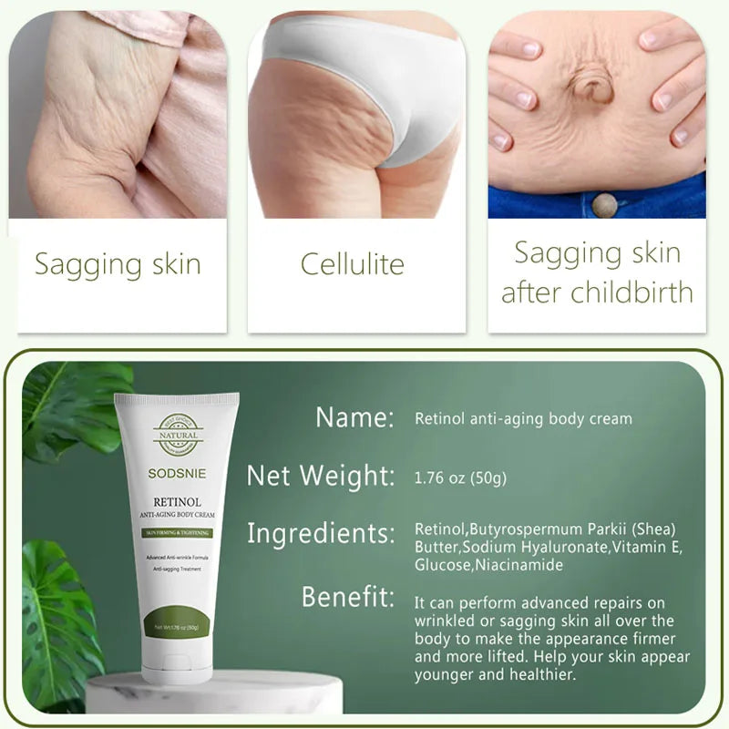 1. Our Retinol Anti-Wrinkle Body Cream helps reduce wrinkles, fine lines and improve sagging skin, reduce skin pigmentation, reduce and delay skin aging